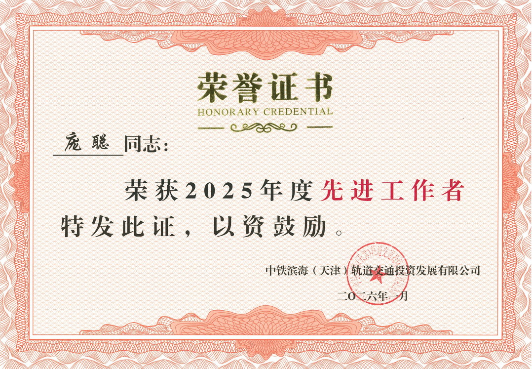 近日,天津市轨道交通Z2线PPP项目2026年建设管理工作会在津顺利召开,众诚检测公司综合部部长庞聪作为企业代表参会,并代表公司领取“优秀检测单位”荣誉奖项。同时,庞聪同志凭借在项目中的突出贡献,被授予“先进工作者”荣誉证书,彰显了企业与个人在轨道交通建设领域的卓越实力。